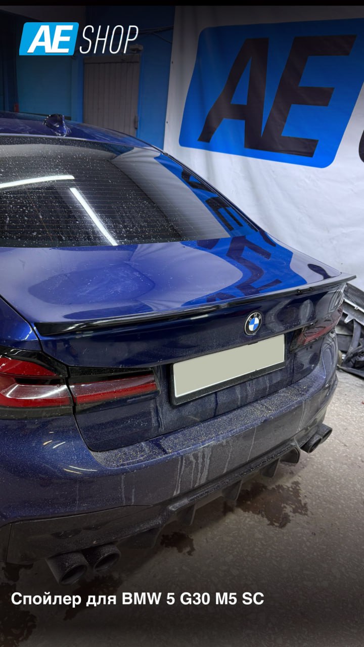 На фото ниже — реальная работа нашей команды AEShop. Владелец BMW 5 серии G30 обратился к нам с конкретным запросом: добавить спортивный акцент, но не перегружать внешний вид. Выбор пал на спойлер в стиле M5 — компактный, с чётким ребром, идеально повторяющий линию крышки багажника.